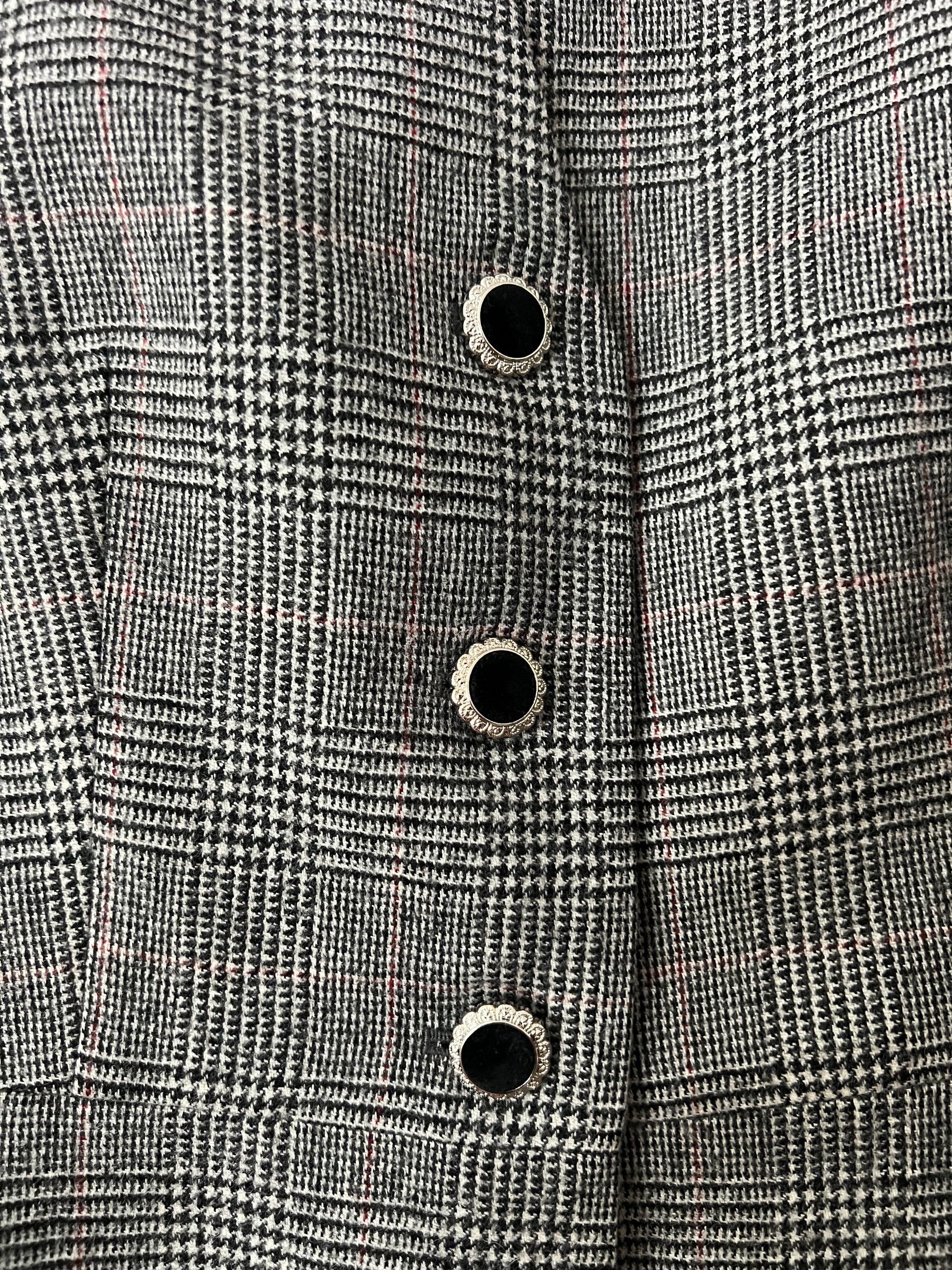 This Brooks Brothers plaid blazer features a tailored silhouette with a unique pleated-style collar. Designed with a single button cuffed sleeves and a three-button front closure with a v-neck cut. Crafted with a wool-blend exterior and a smooth silk lining. A polished piece that works well for both professional and elevated casual wear. In excellent condition.