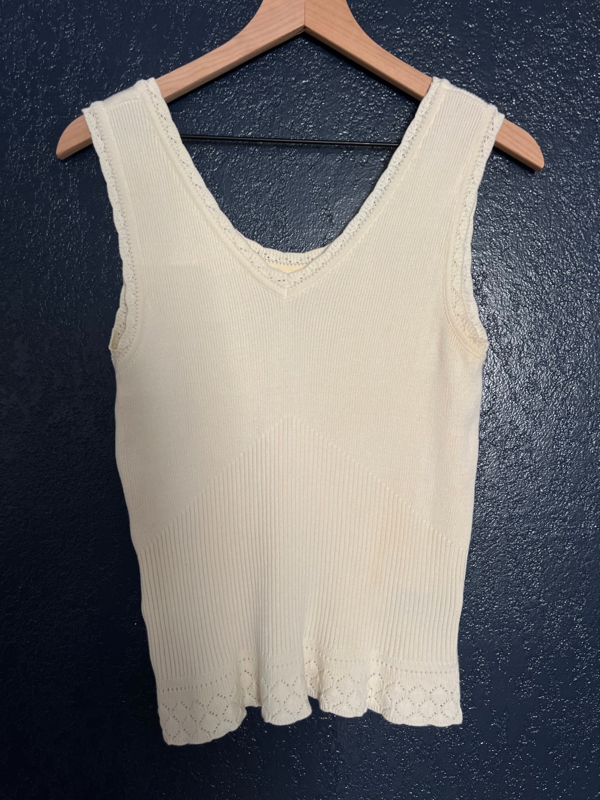 Effortlessly chic, this versatile knit tank features a unique dual-neck design: a scoop neckline on one side and a V-neck on the other, allowing you to wear it two ways. Crafted in a soft, creamy knit, it it features ribbing detailing for a touch of texture and elegance. Perfect for layering or wearing on its own for a sophisticated, modern look. No size tag or brand. Very similar to Sezane styles.