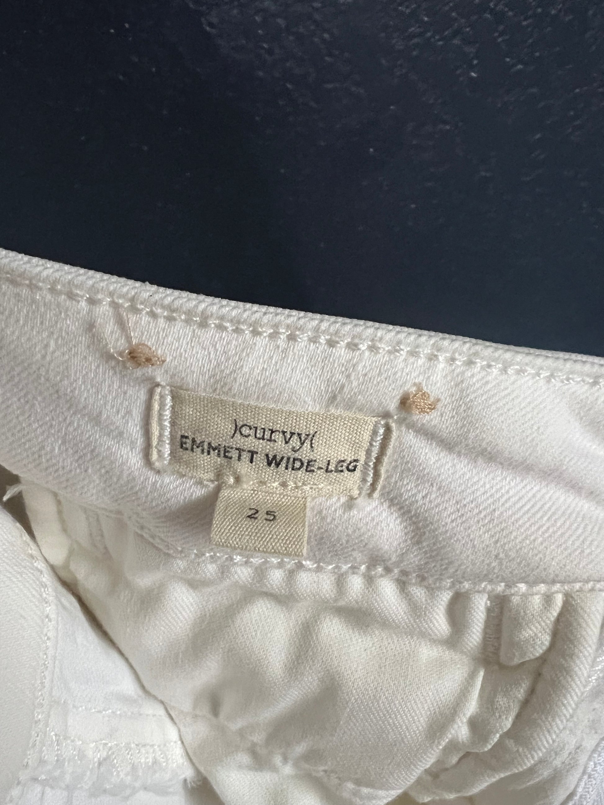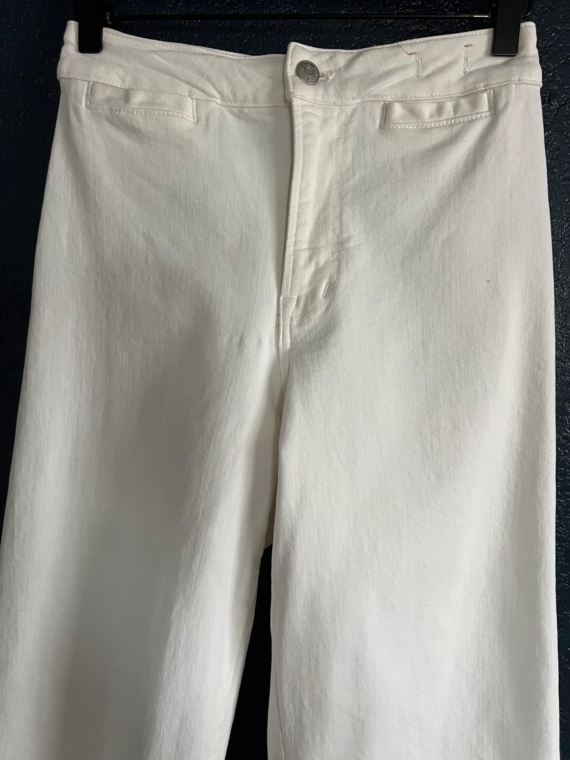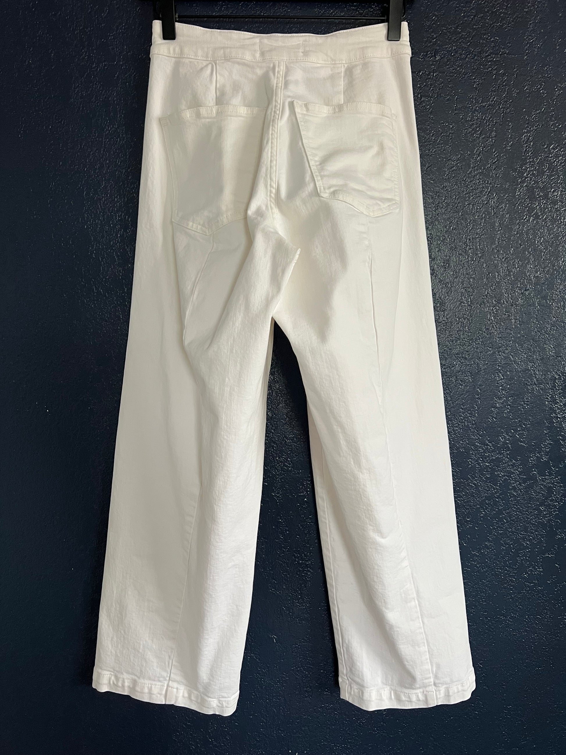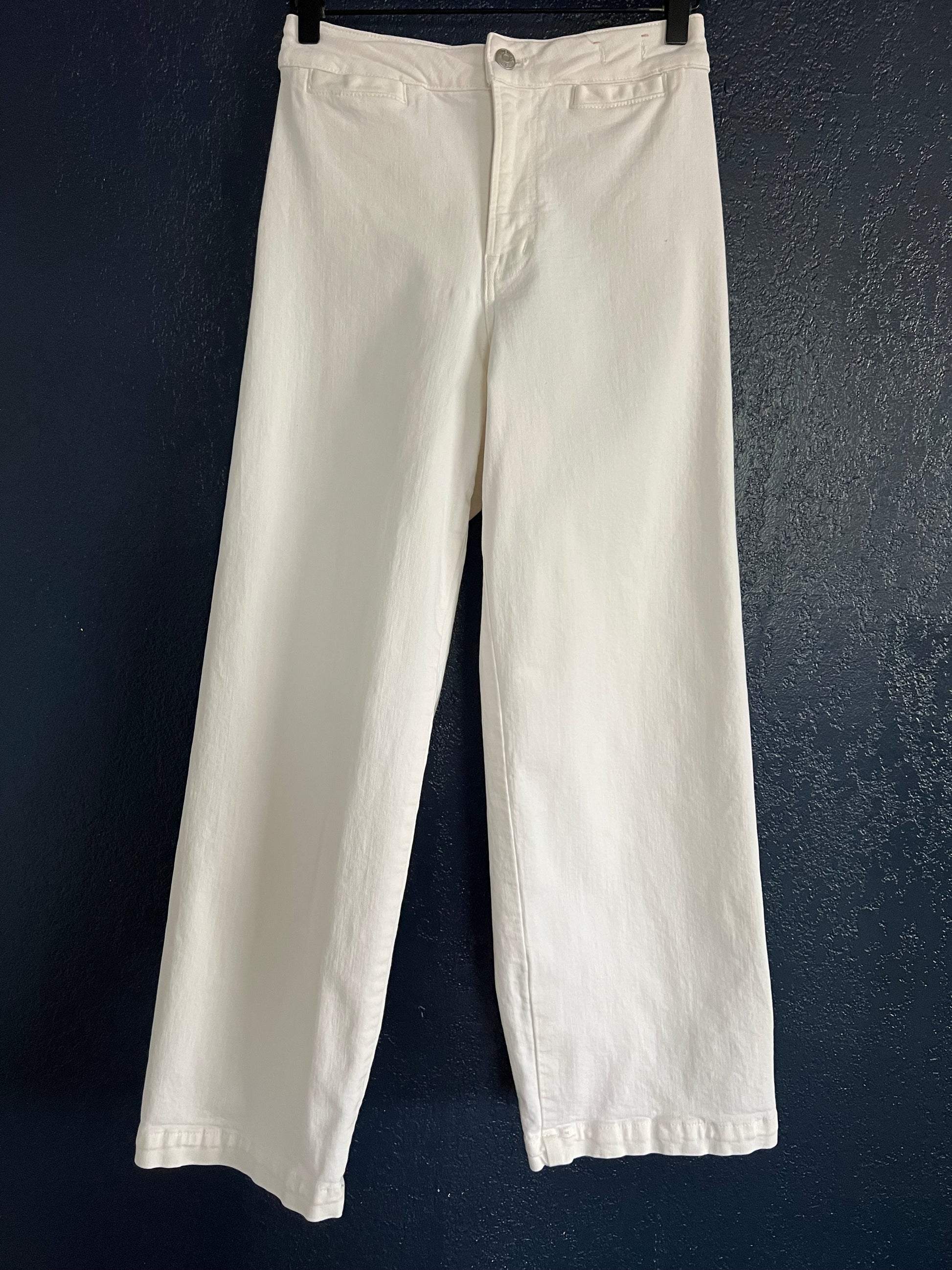 Designed for an hourglass shape, these iconic cropped wide-leg jeans feature a contoured waistband, a longer rise, and extra room in the hips and thighs for a flattering fit. Crafted from premium white Cone® denim with just the right amount of stretch, they provide comfort without losing shape or becoming see-through. Complete with slouchy wide legs and sleek front welt pockets, these jeans are effortlessly chic and perfect for a versatile, modern wardrobe. In good condition with no stains or tares.