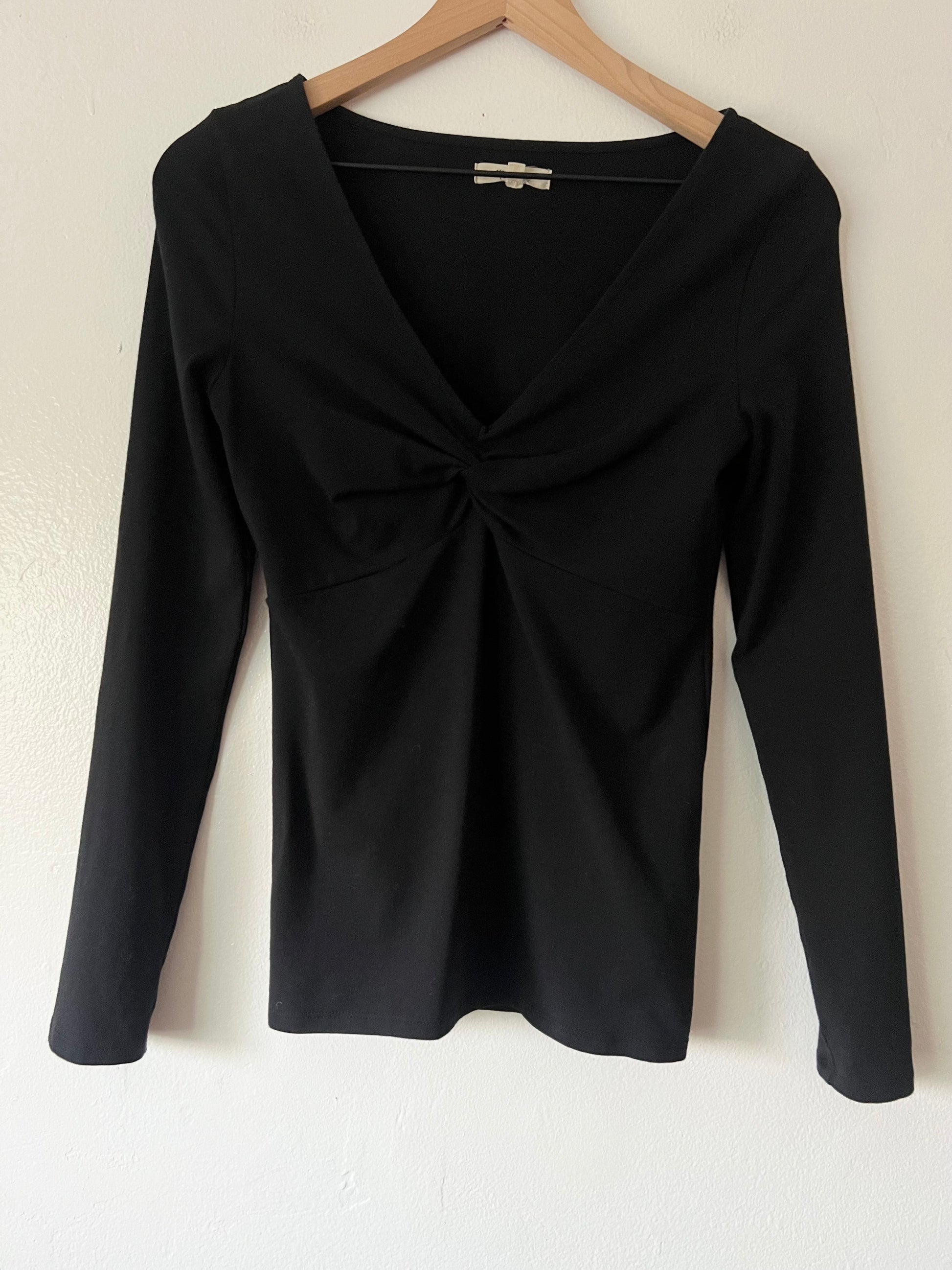 A soft and easy everyday piece. Crafted in fine cotton jersey, this fitted V-neck tee features a flattering twist-front detail that adds shape and interest. Designed to hit at the high hip or just below, making it perfect to tuck or wear as-is. Excellent preowned condition.