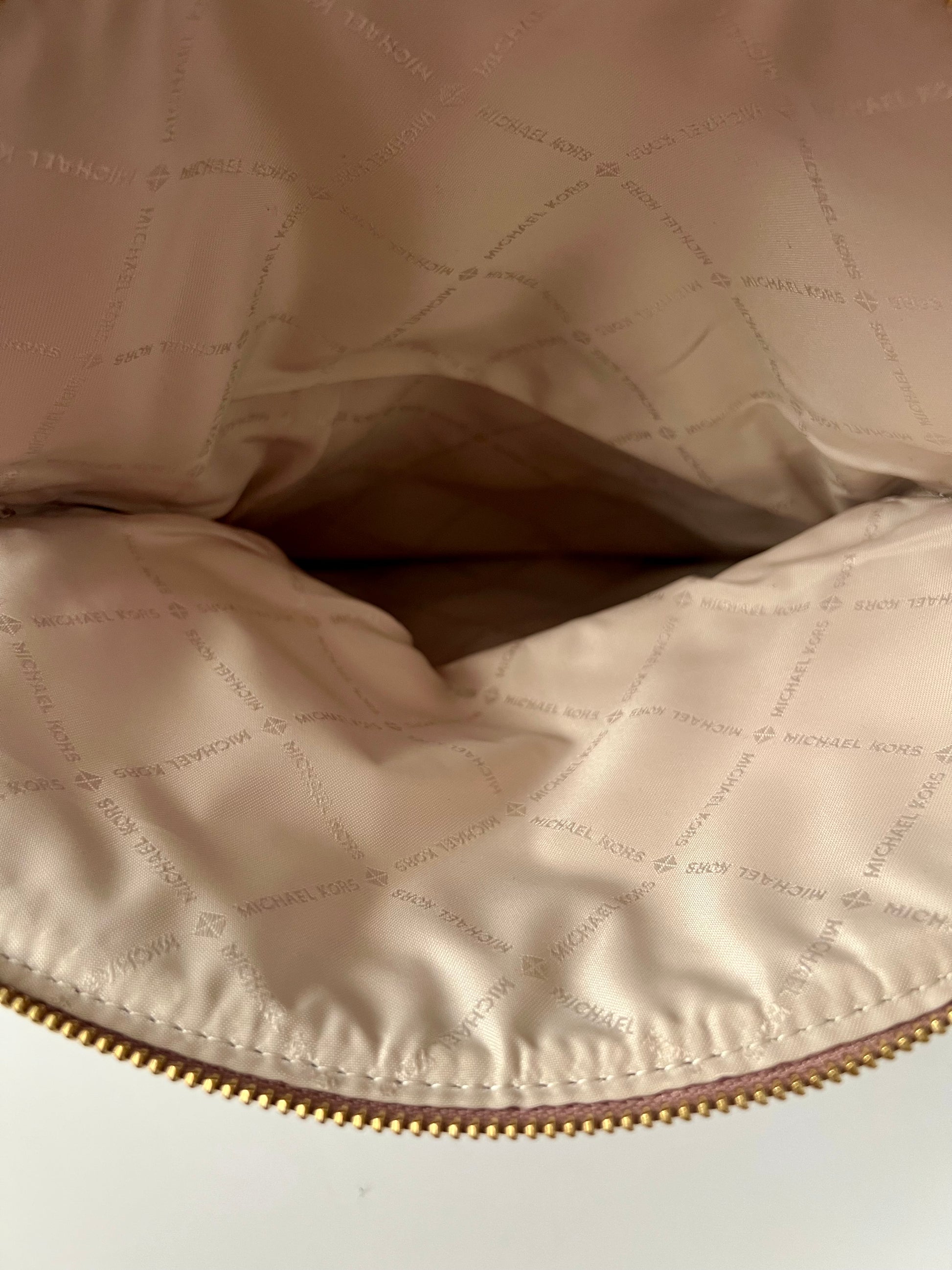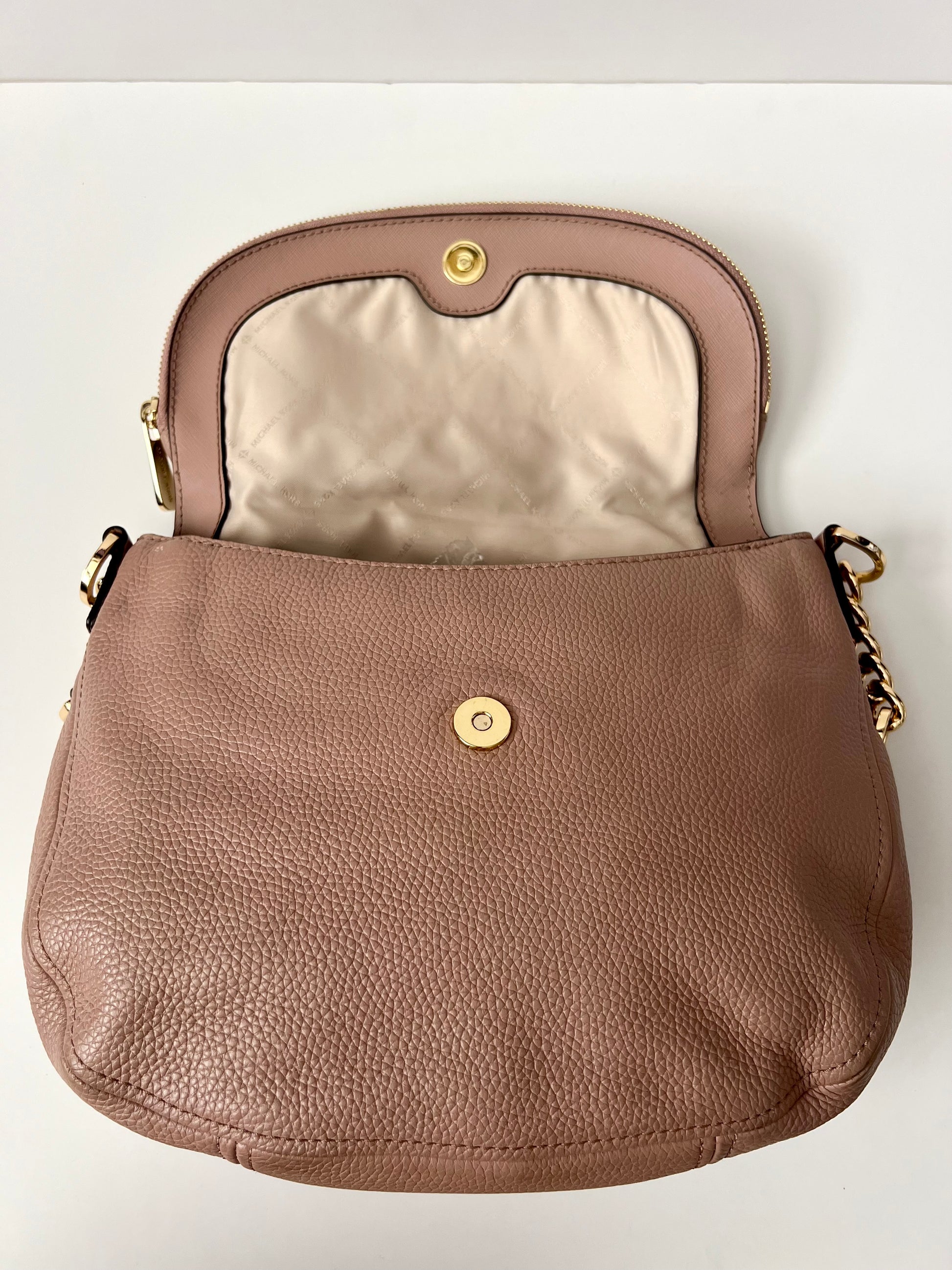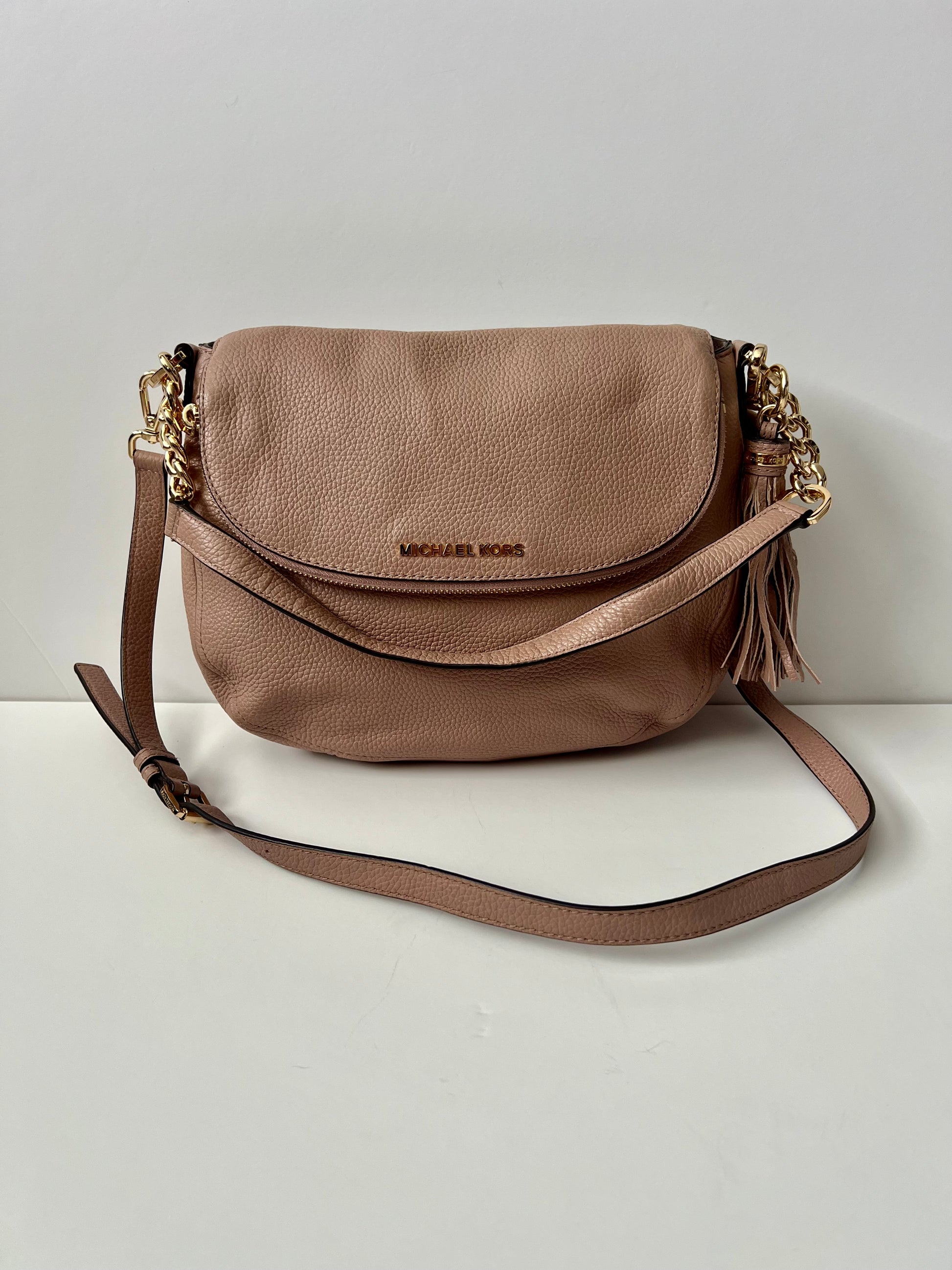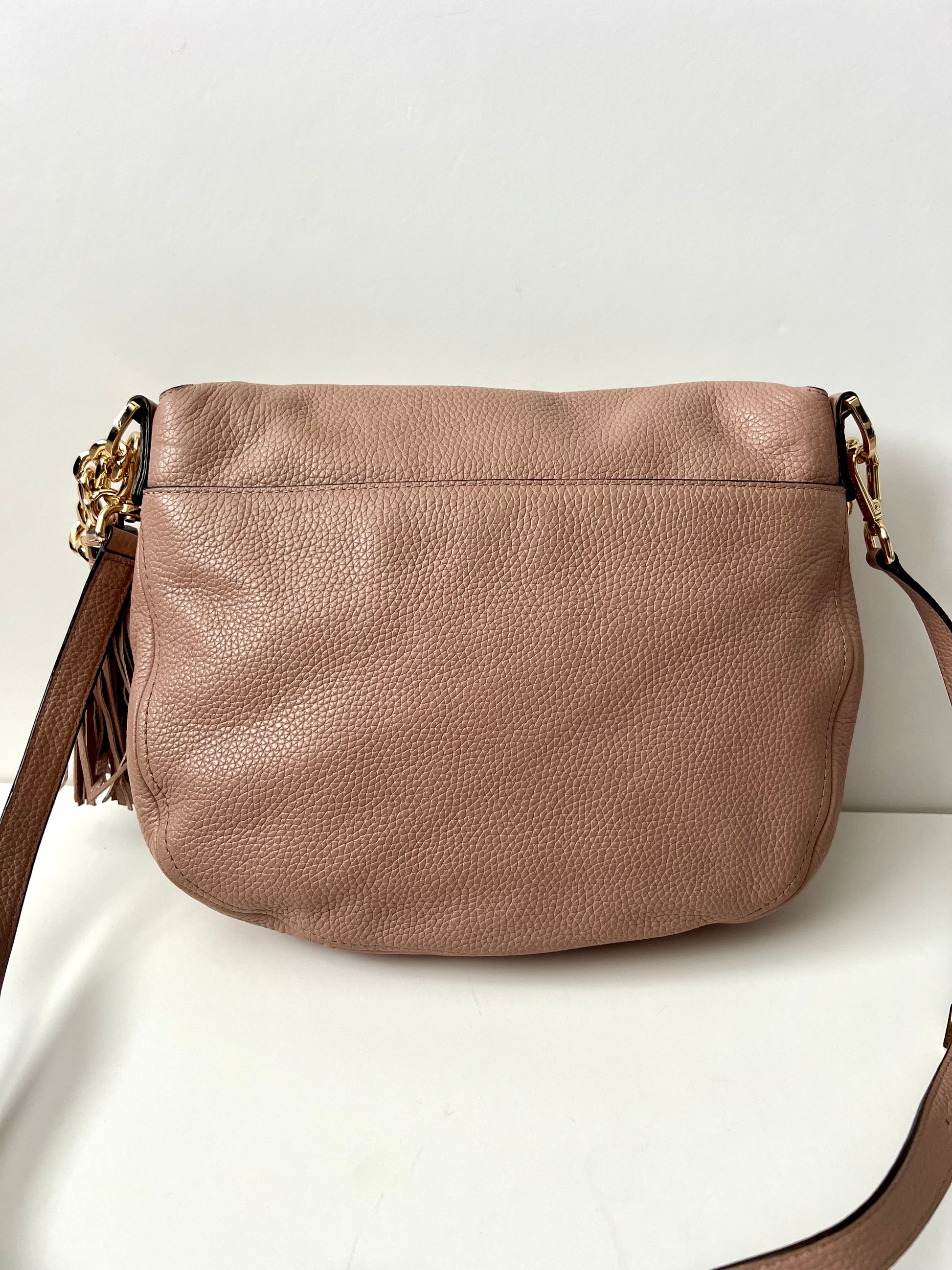 This Michael Kors Bedford Crossbody Bag blends everyday function with elevated style, crafted from soft pebbled leather and finished with gold-tone hardware throughout. The fold-over flap includes a zippered compartment for extra storage, while a hidden slip pocket beneath the flap reveals built-in card slots for added convenience. The main interior features a zip pocket and two additional slip pockets. Both the front and back pockets are secured with metal snap closures. Designed for versatility, it comes with a shoulder-length chain-accented strap, a removable crossbody strap, and a detachable tassel. In excellent condition overall, with only the slightest bit of wear under the flap near the corner that is not noticeable unless inspecting very closely. Clean interior.