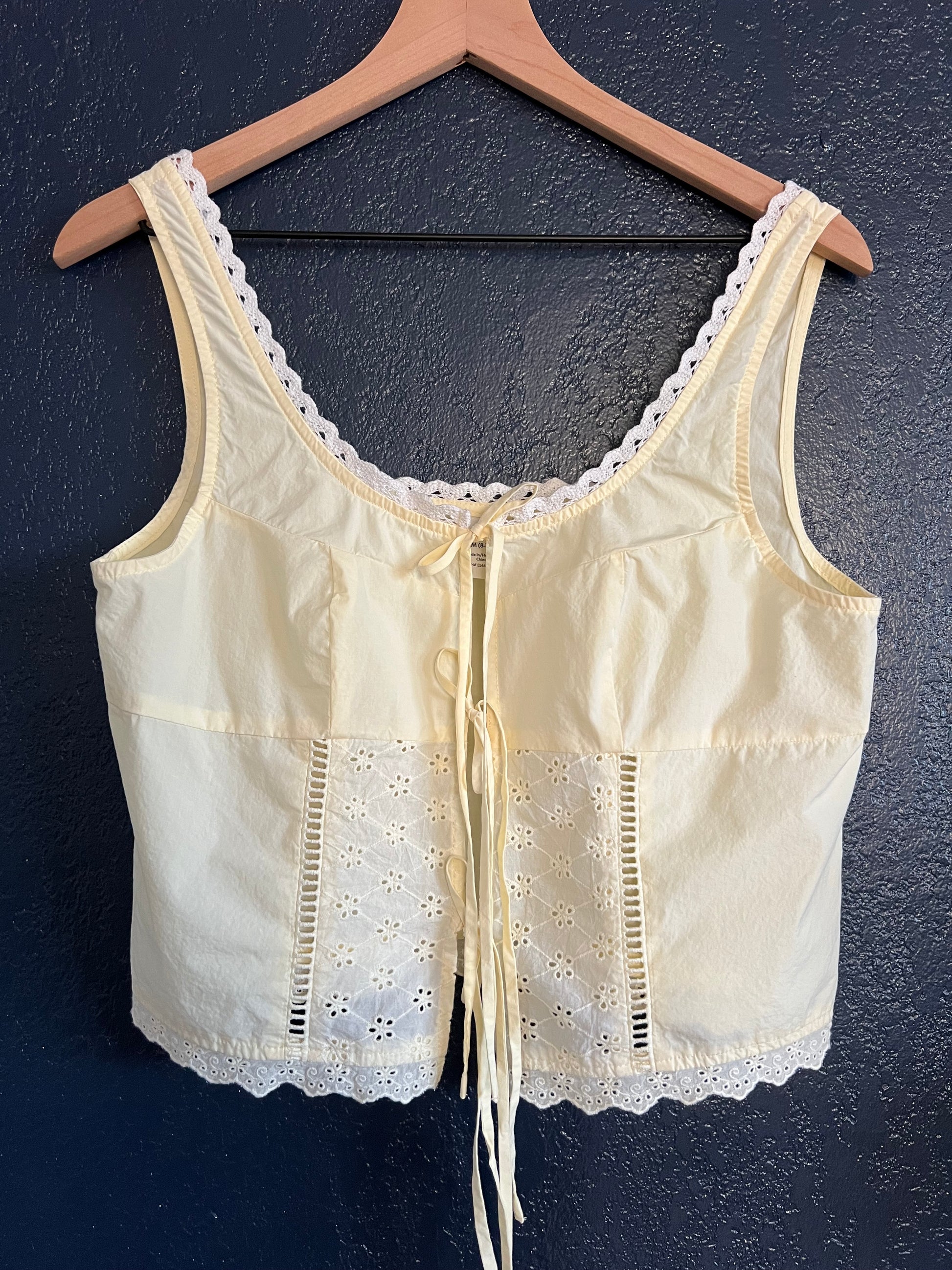Sweet and feminine with a hint of vintage charm, this No Boundaries tank top features delicate eyelet lace panels, scalloped trim, and soft ribbon tie closures. The scoop neckline is framed with dainty crochet lace, while the adjustable ties down the front add a playful, corset-inspired touch. Lightweight and breathable. In excellent condition.
