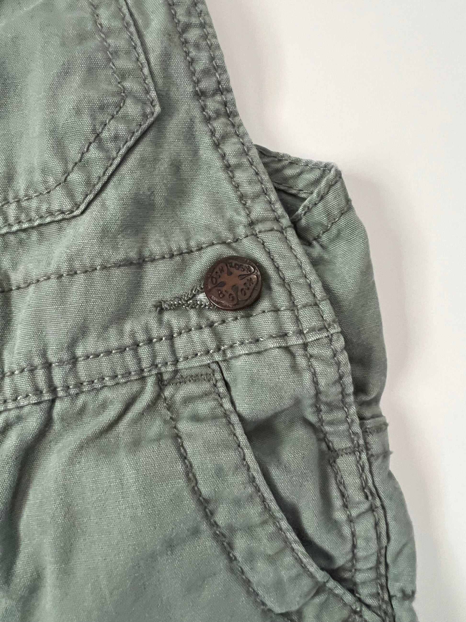 Classic green OshKosh short overalls designed with durable metal hook closures at the straps, a front pouch pocket, hammer loop detail, and utility-style side patch pockets. Finished with snap closures along the inseam for easy changing. In excellent condition with no flaws.