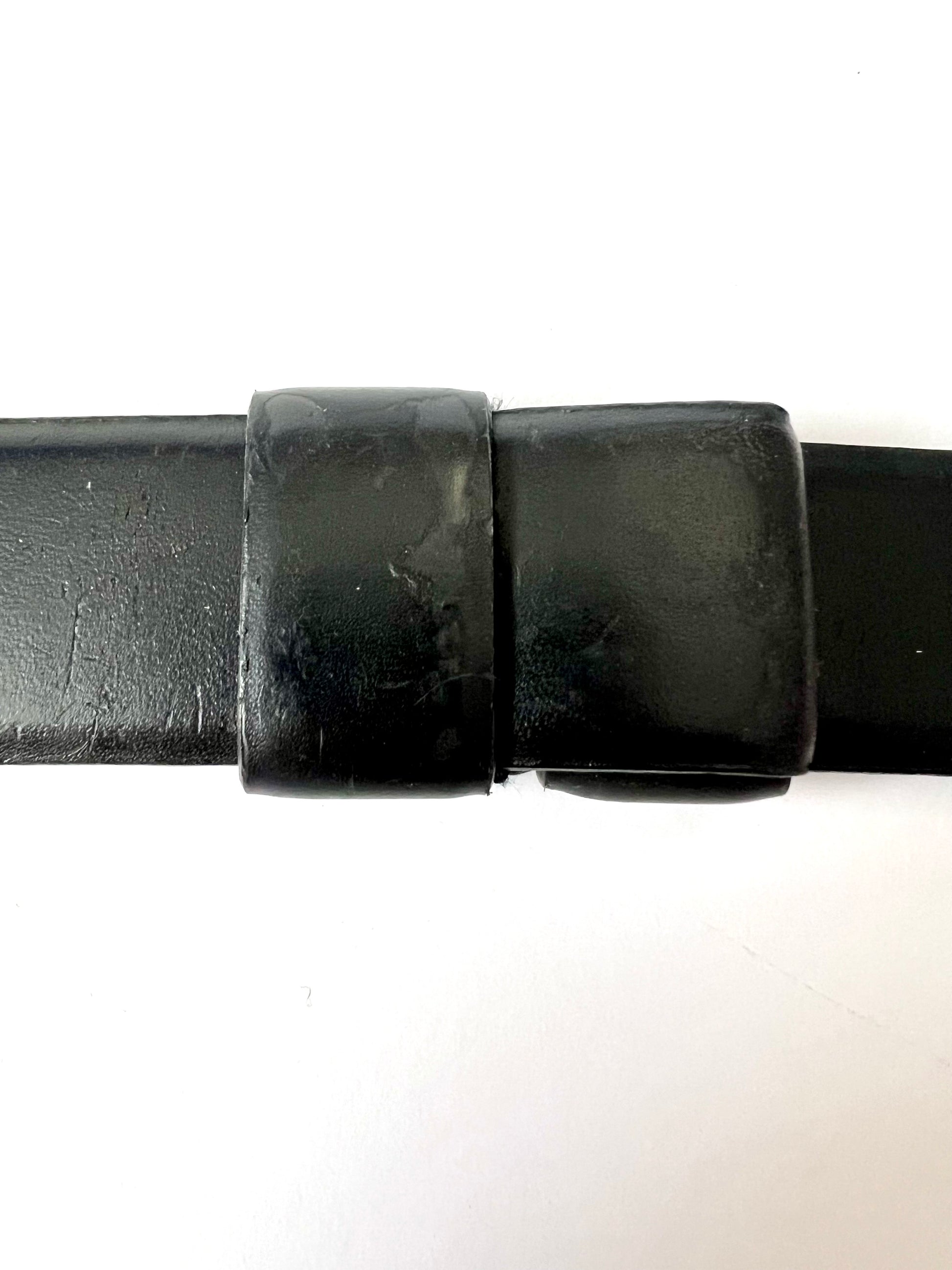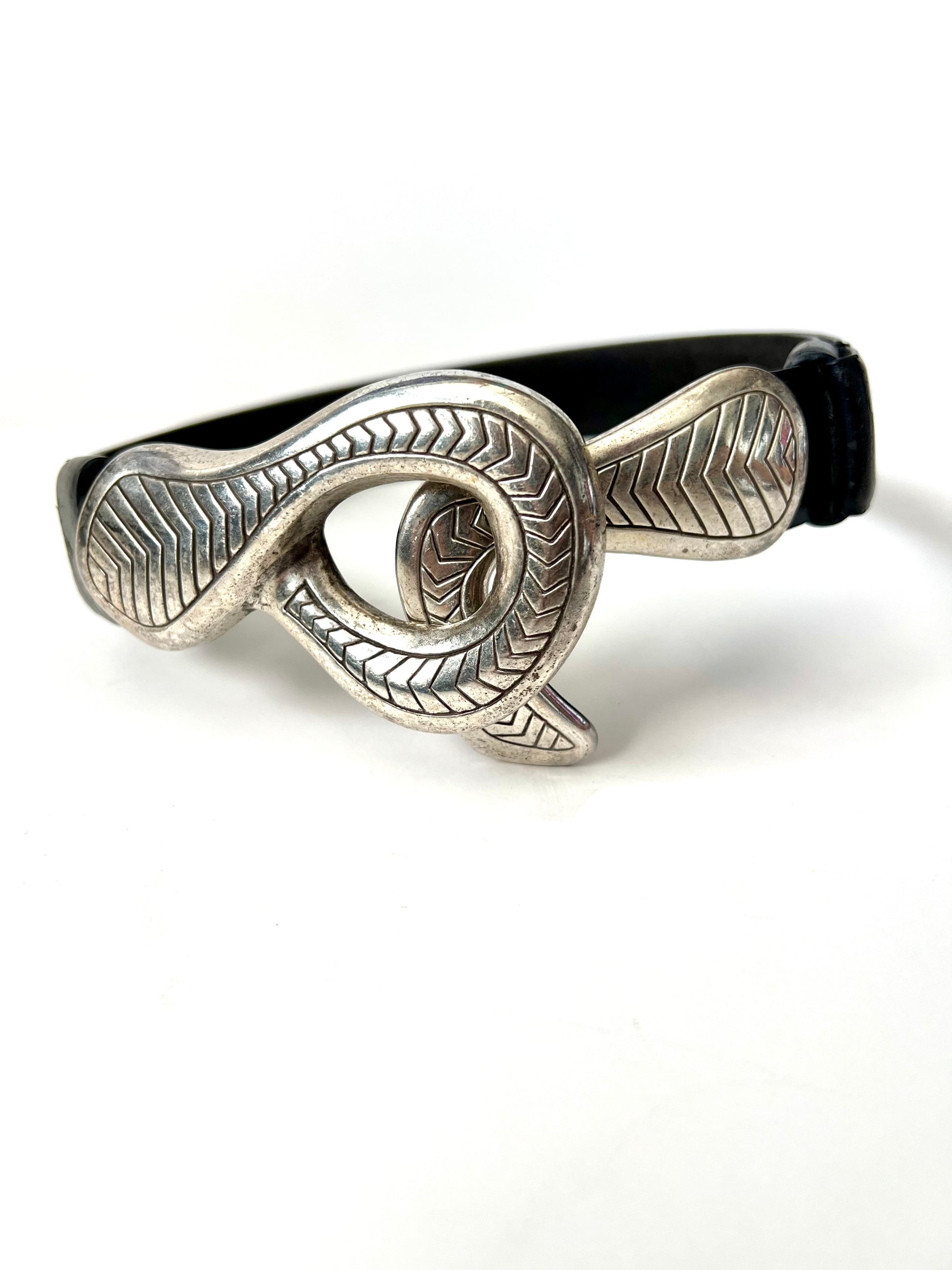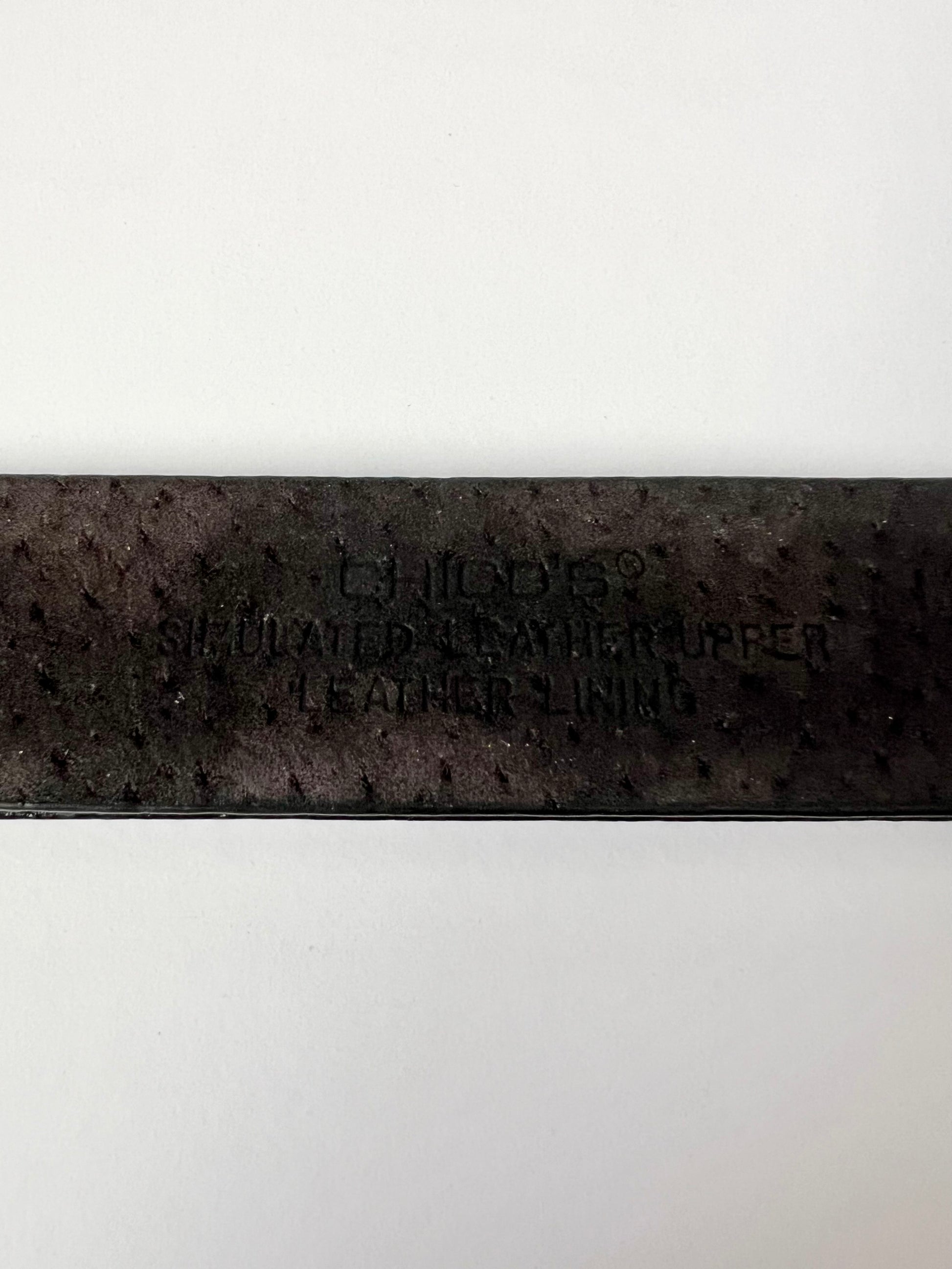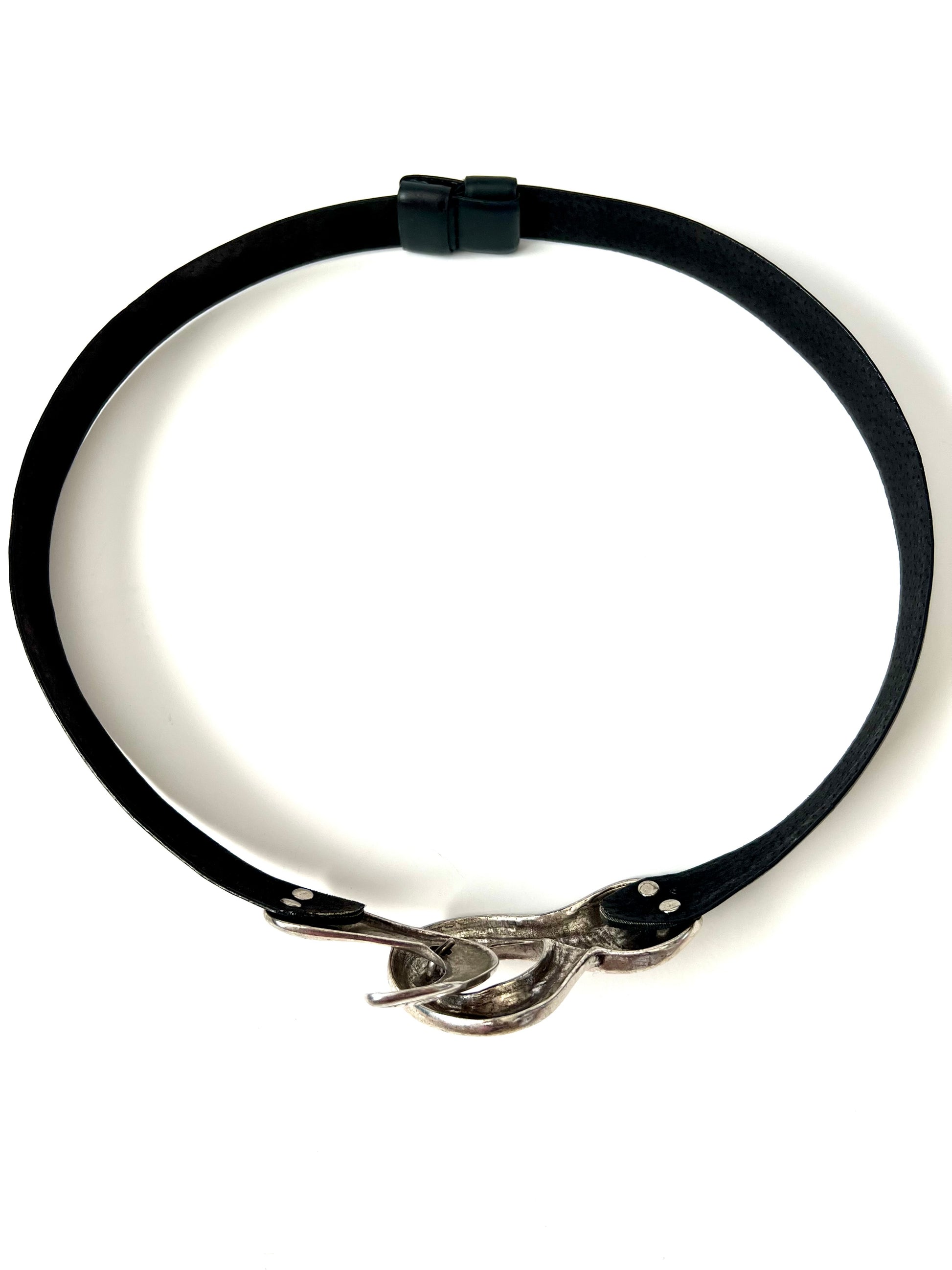 Add a touch of vintage flair to your outfit with this stylish Chico’s leather belt. Crafted from genuine leather, this belt features a unique adjustable design with silver hardware. One end is finished with a sleek loop-shaped buckle, while the other has a coordinating hook-shaped clasp—locking together securely. This belt is a Size Small but can be adjusted to fit a range. It shows some minor scuffing from wear, but is still in overall good condition with plenty of life left. A perfect statement accessory.