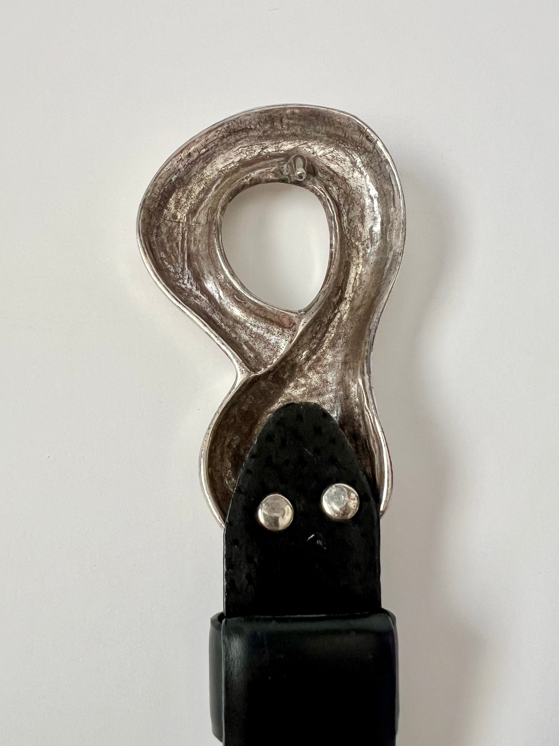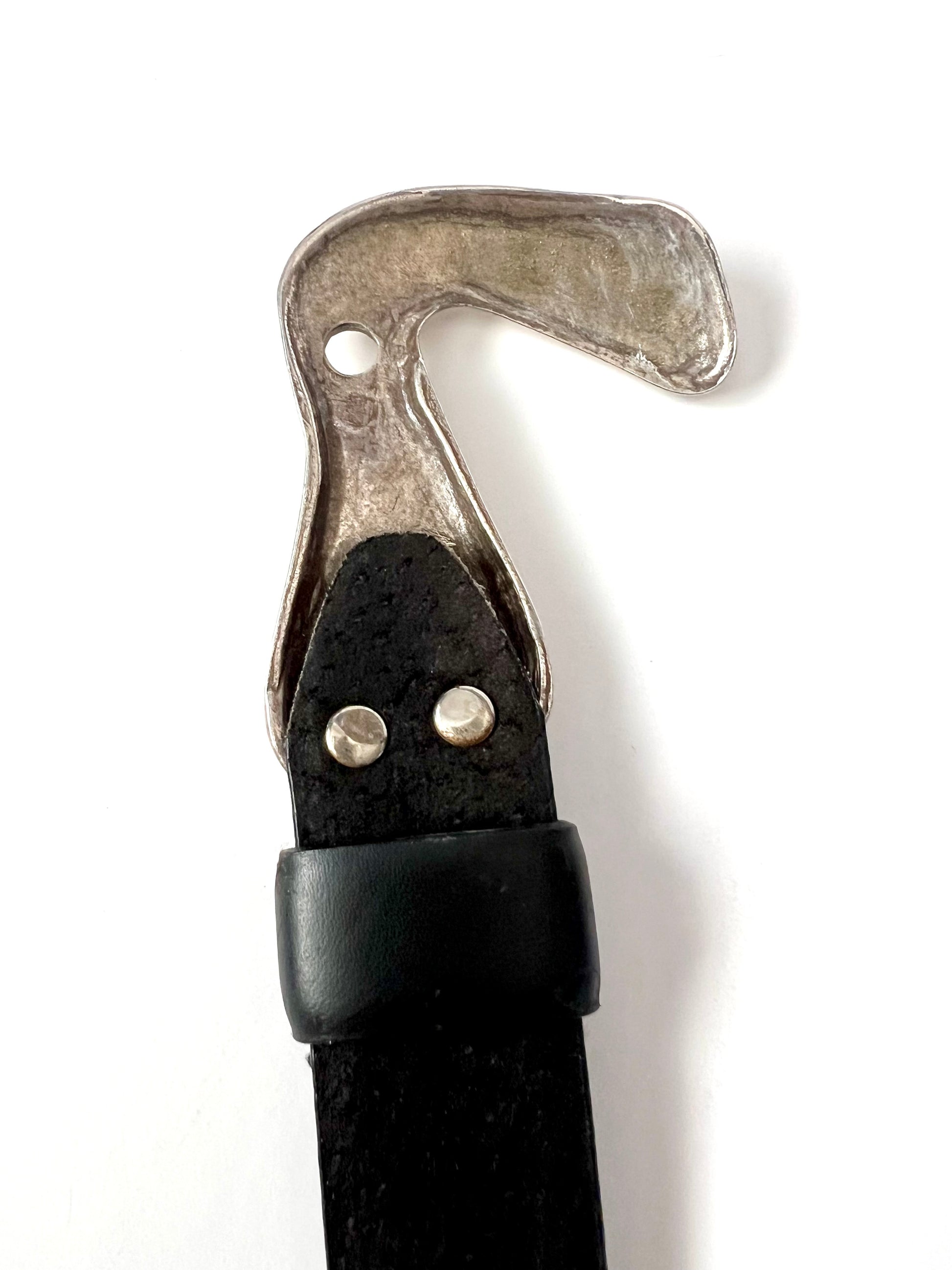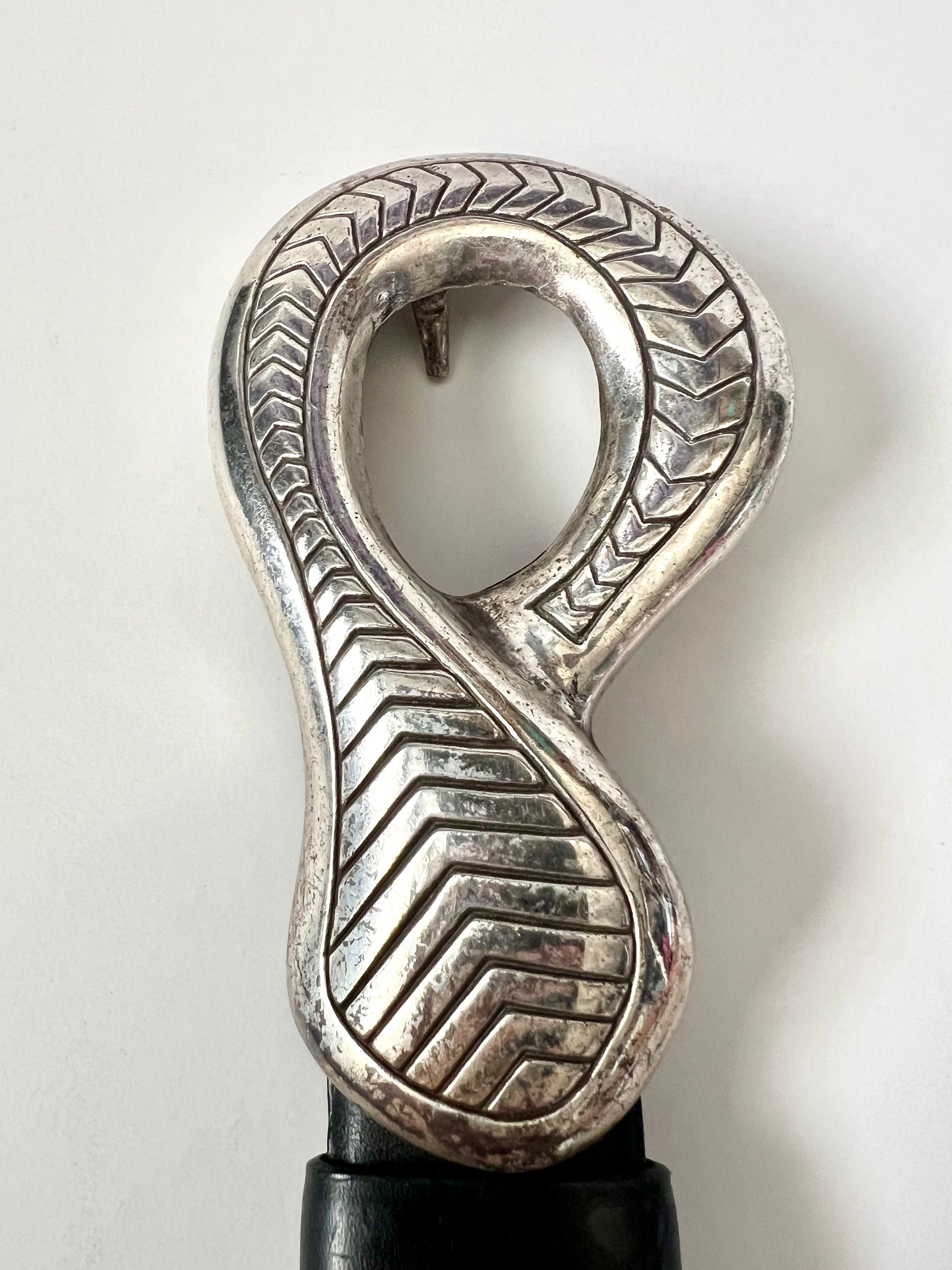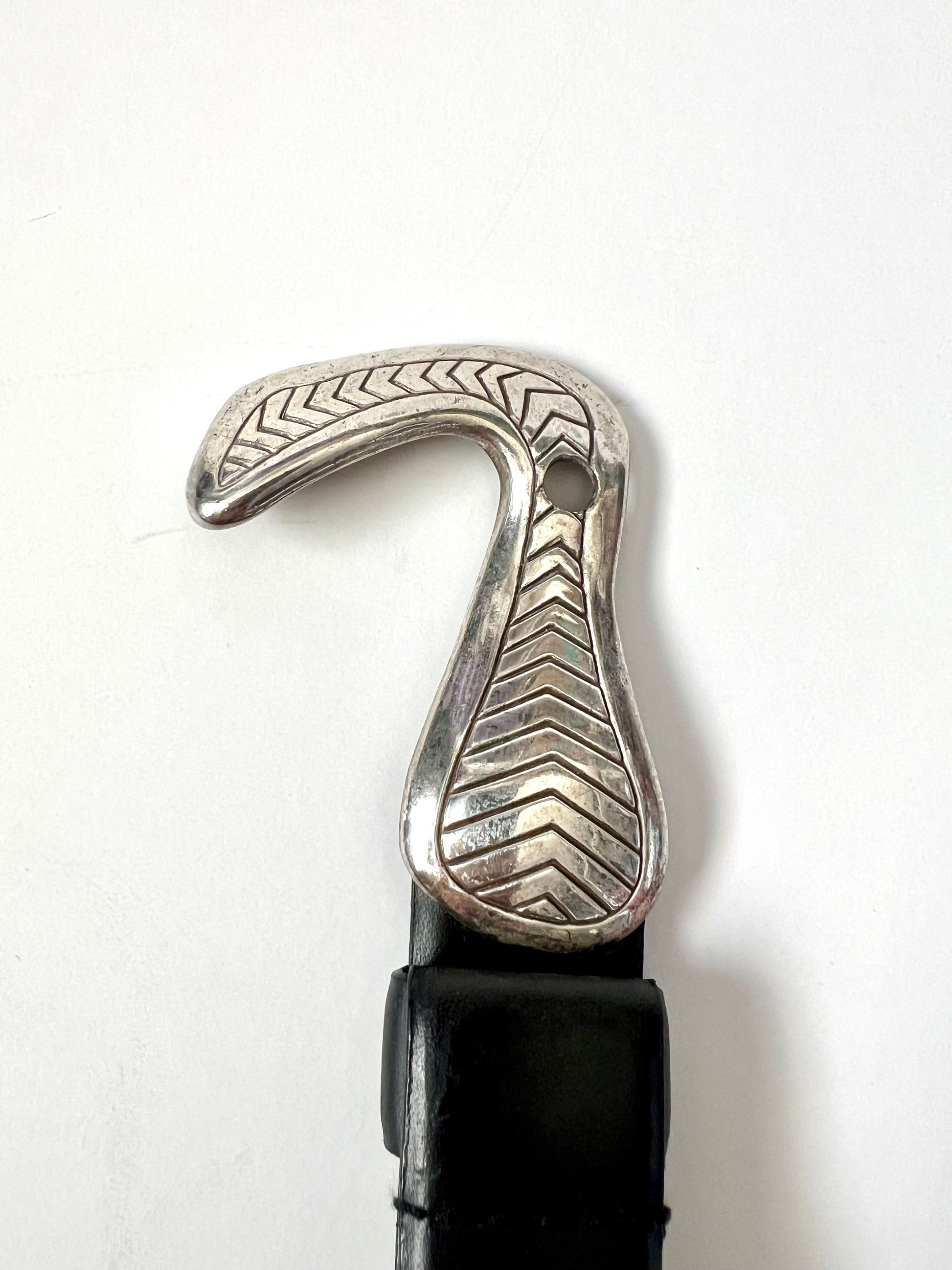 Add a touch of vintage flair to your outfit with this stylish Chico’s leather belt. Crafted from genuine leather, this belt features a unique adjustable design with silver hardware. One end is finished with a sleek loop-shaped buckle, while the other has a coordinating hook-shaped clasp—locking together securely. This belt is a Size Small but can be adjusted to fit a range. It shows some minor scuffing from wear, but is still in overall good condition with plenty of life left. A perfect statement accessory.
