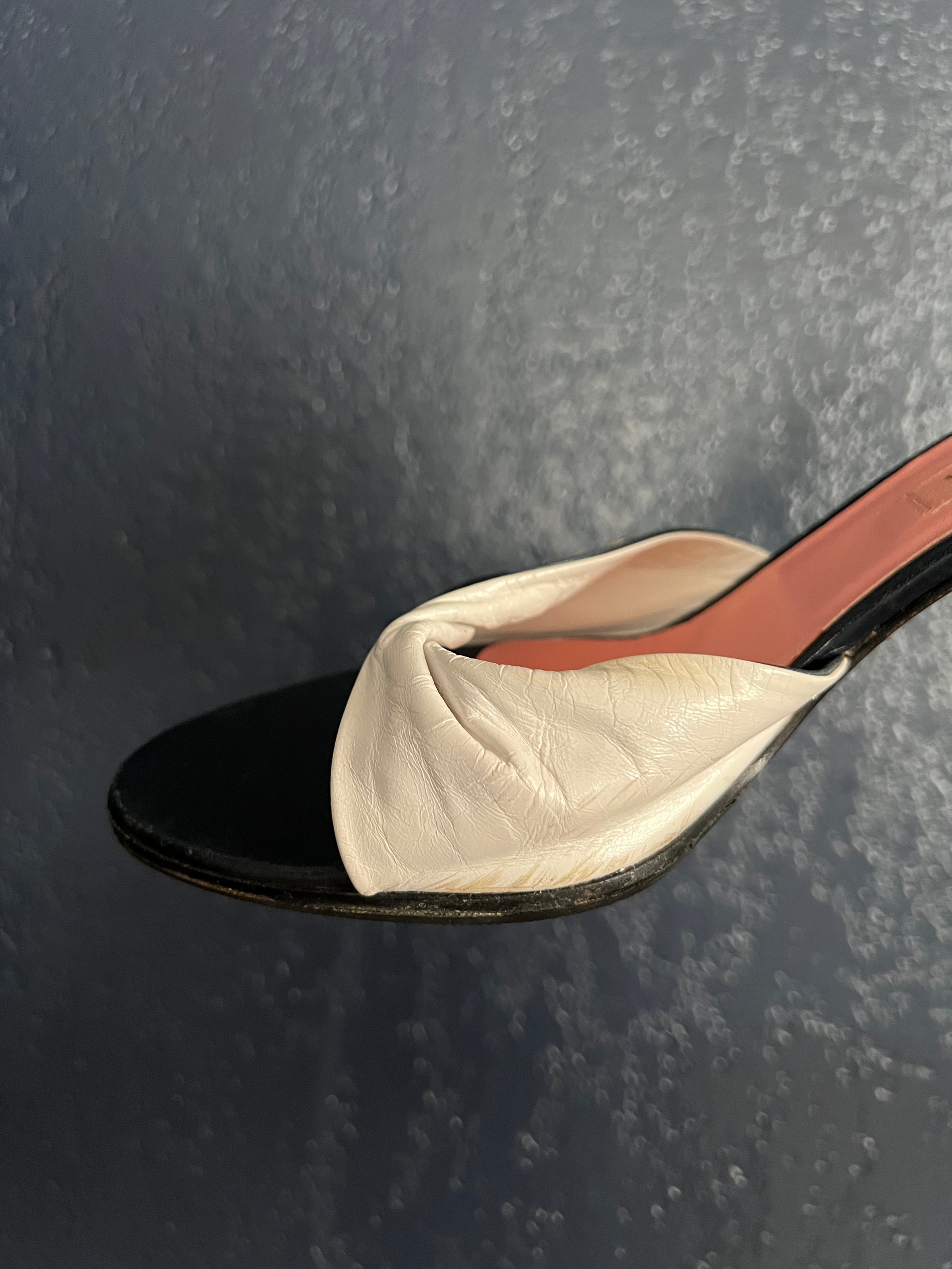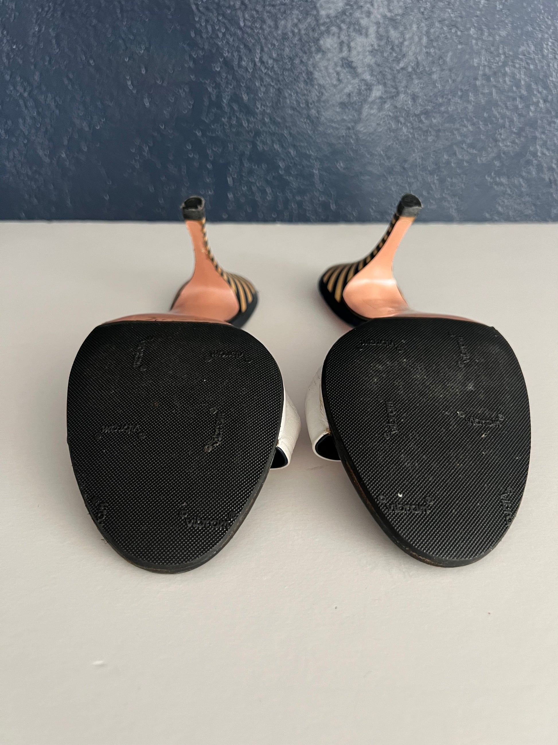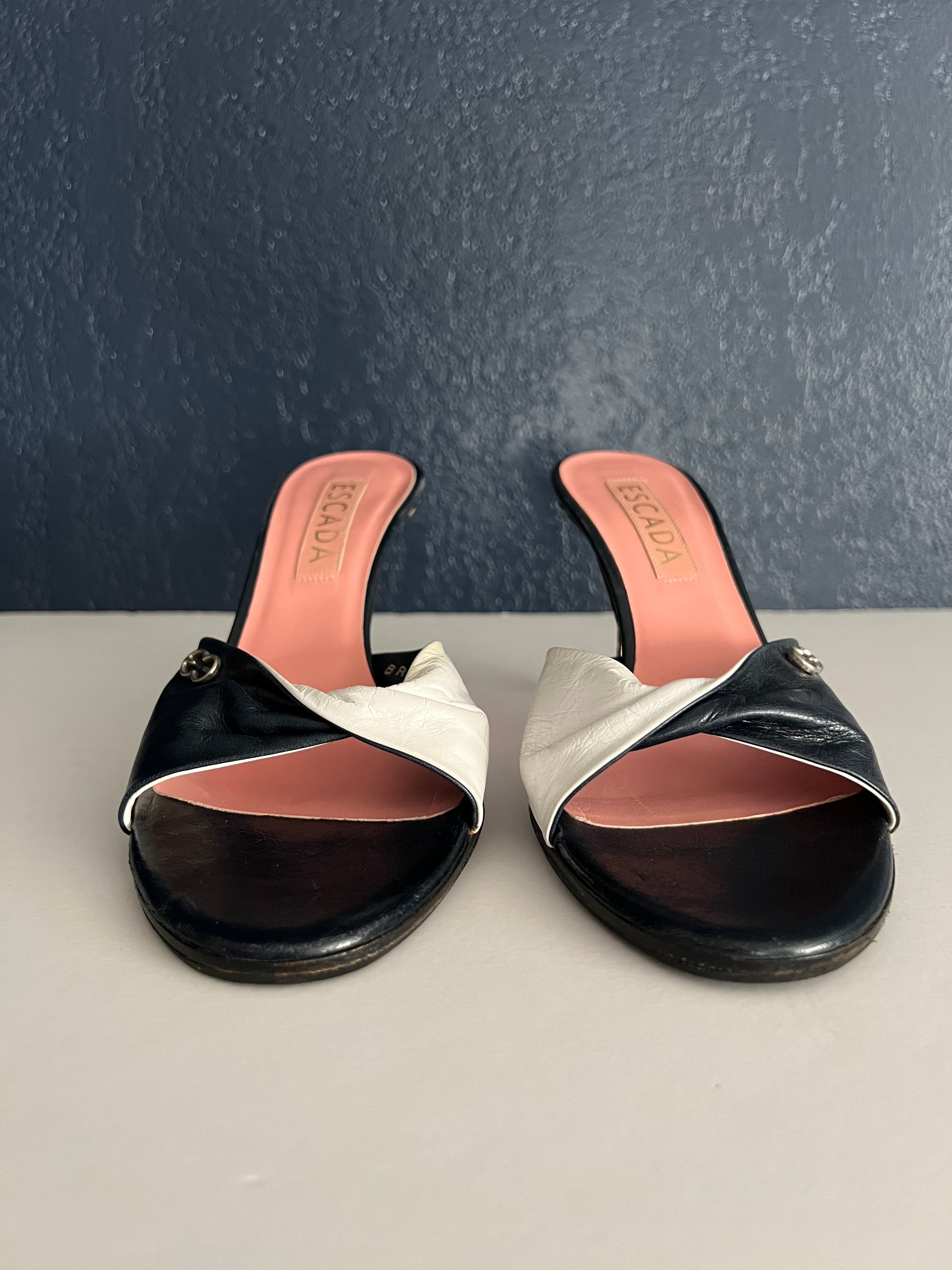 These chic vintage Escasa heels feature a unique twisted leather front with a striking blue and white contrast. Designed with a comfortable mid-height heel and bold striped detail, they’re both fashion-forward and wearable. Overall good vintage condition with normal wear from age. Minor discoloration on the white leather (visible in photos); can be touched up with leather paint if desired. Recently resoled for durability.