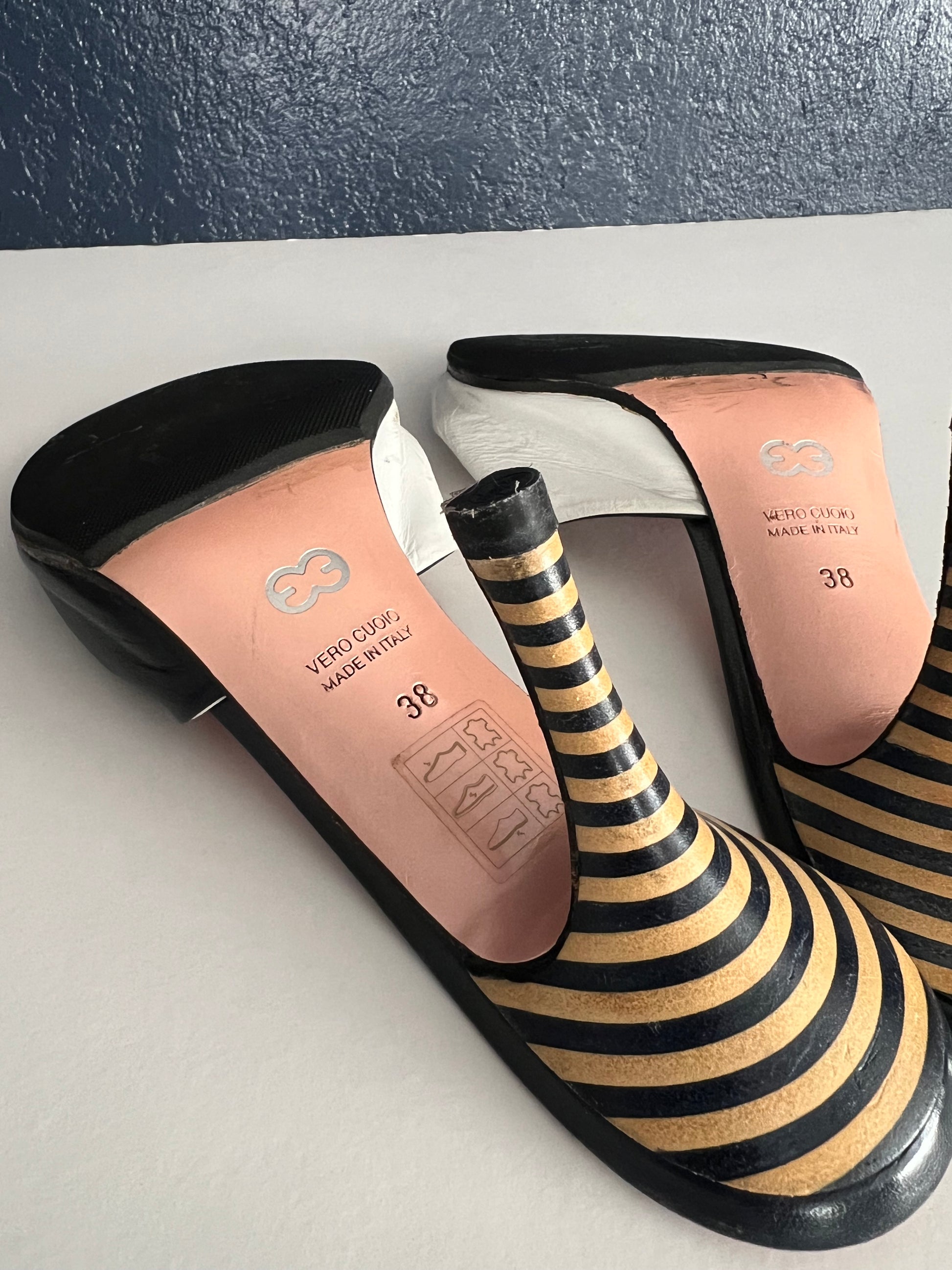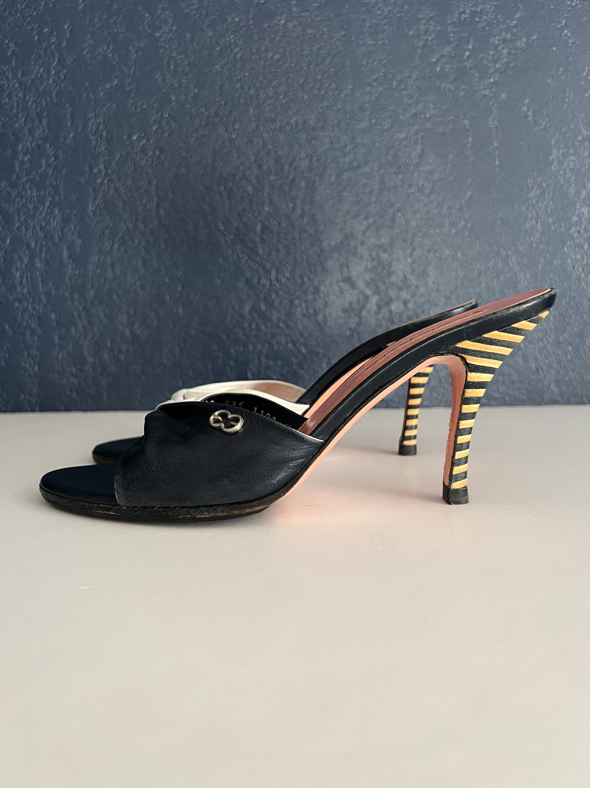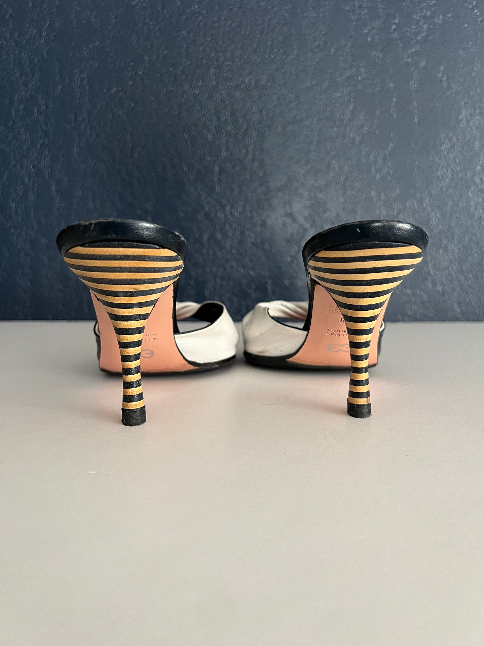 These chic vintage Escasa heels feature a unique twisted leather front with a striking blue and white contrast. Designed with a comfortable mid-height heel and bold striped detail, they’re both fashion-forward and wearable. Overall good vintage condition with normal wear from age. Minor discoloration on the white leather (visible in photos); can be touched up with leather paint if desired. Recently resoled for durability.