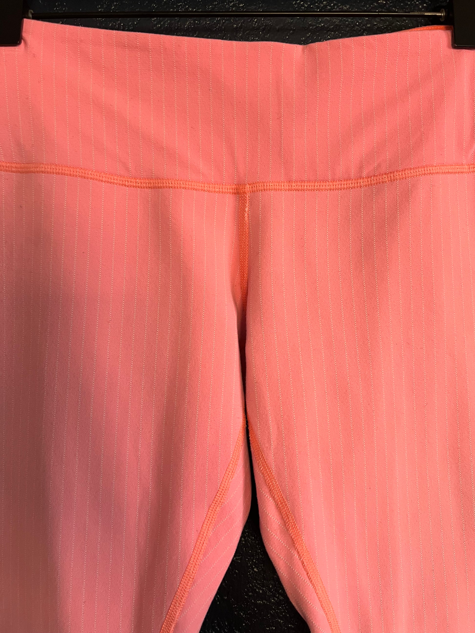 These retro pink striped cropped lulu leggings offer incredible support and coverage, four-way stretch, and cool naturally breathable sweat-wicking material. In good condition.