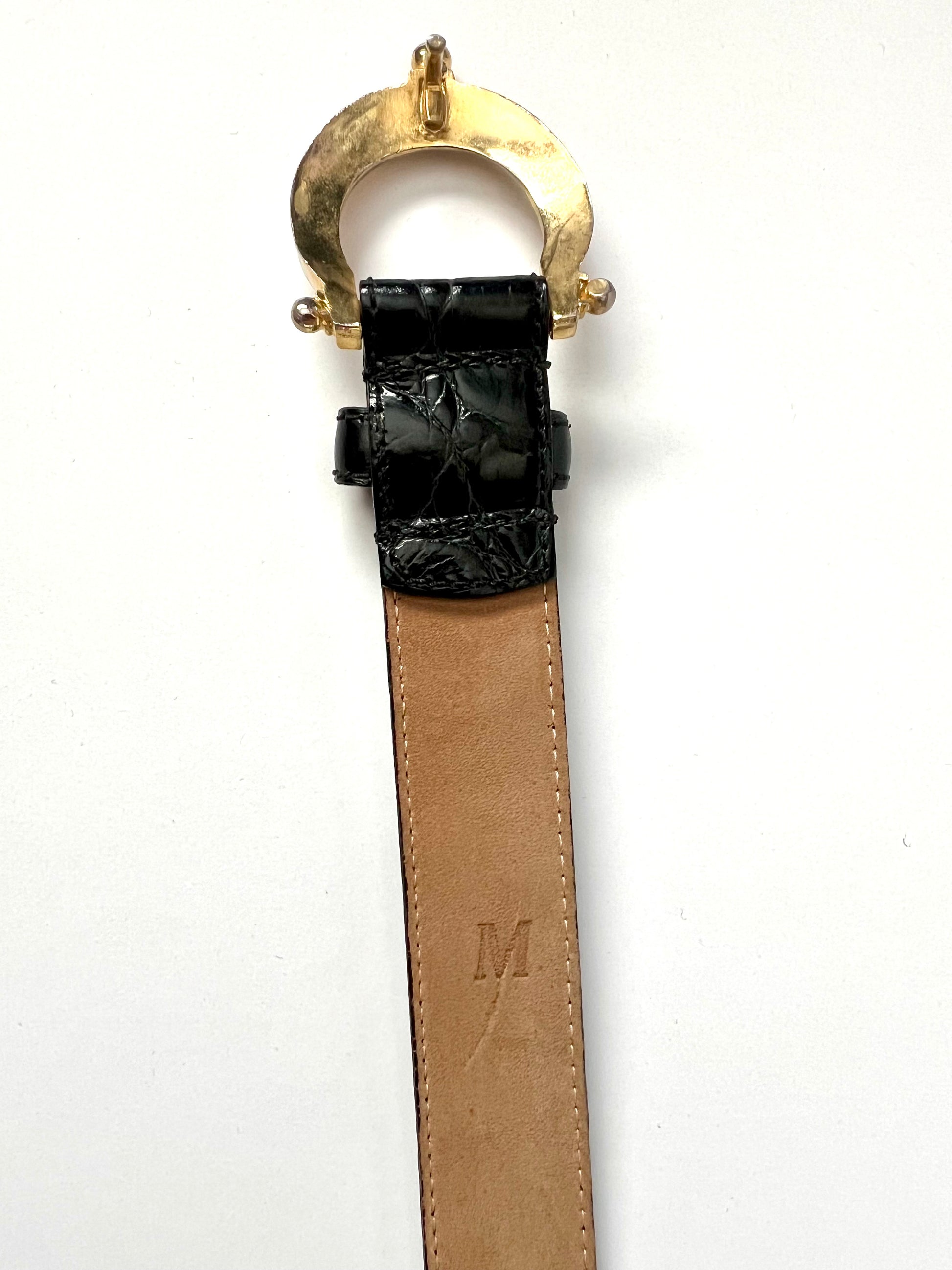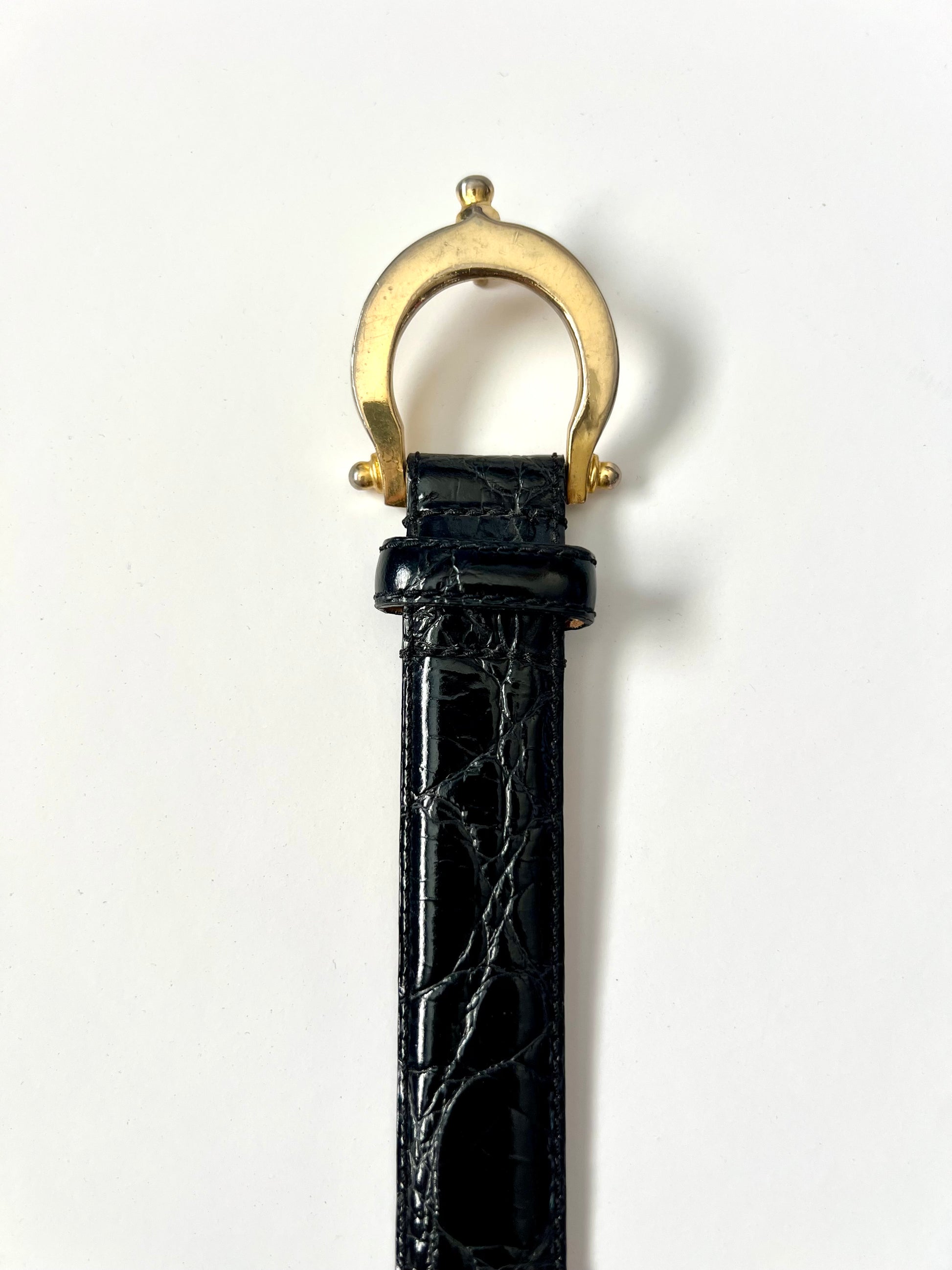 This elegant vintage belt from Nordstrom is crafted from Italian calfskin leather and adorn with a black croc-embossed pattern for a refined, textured finish. The belt features a unique gold-tone hook closure, offering a sleek and minimalist alternative to a traditional buckle.