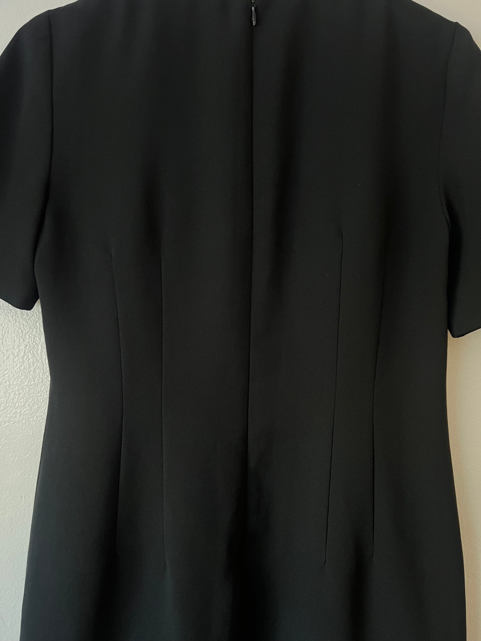 Timeless vintage little black dress beautifully tailored to flatter and highlight the body’s natural shape, creating a sleek and feminine silhouette. Polished and sophisticated with short sleeves, a rounded neckline, and fully lined. In excellent condition. Similar style to Calvin Klein.